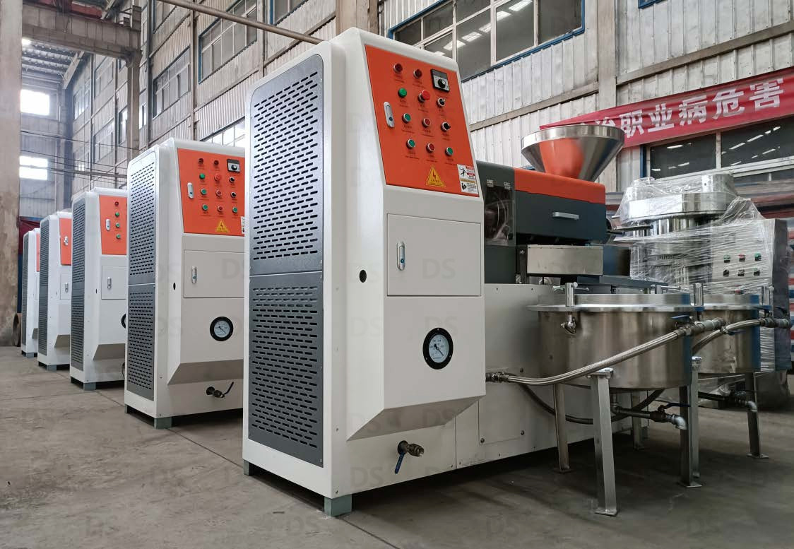 花生榨油機油料要干燥、精選。油料榨油時應曬干、揚凈,使其水份不大于 12% ,雜質不大于 0.5%,特別應注意的是,許多用戶忽略了油料精選項這一必不可少的預處理工序,以為可有可無。殊不知,不經精選或選得不好的油料,灰塵會堵塞油路,砂石會對零件的磨損,不僅對榨油機設備正常工作的影響,而且還會大縮短榨螺、榨條、出餅口使用壽命。如油料中混有石塊、金屬等硬物,會立即損壞榨螺。因此,一定要重視搞好油料精選這一關,可收到事半功倍的效果。為什么一定要炒呢?是因為對生胚或餅進行濕熱處理,使其具有一定彈性和塑性利于壓榨的熟坯過程。蒸炒的目的破壞油籽細胞結構;使蛋白質變性(減少對油脂的吸附 力和適宜的塑性);提高油脂質量(減少膠體物含量和其它低分子物含量),蒸炒要求:熟度均勻、熟坯具有一定彈性和塑性;
